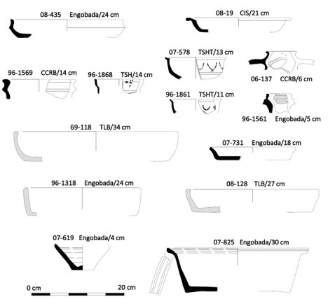 conxunto analizado. Aquelas que se puideron recoñecer non presentaban variedades formais moi diversas, sendo a gran maioría correspondentes a formas pechadas tipo xerra ou botella, no caso da variedade depurada, e distintas formas de olas na variedade pouco depurada. As formas máis comúns localizadas inclúen olas tipo 1 e 2 de Vegas, grandes contedores tipo 12 de Vegas ou un exemplar completo de xerra monoansada moi similar ao tipo 38.7 de Vegas. Se ben as cronoloxías desta cerámica son moi xenéricas (VEGAS, 1973), a súa presenza en contextos estratigráficos xunto a material claramente tardío permiten datala nestes momentos, mostrando así a continuidade da súa produción e de seu consumo.