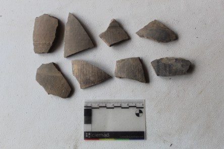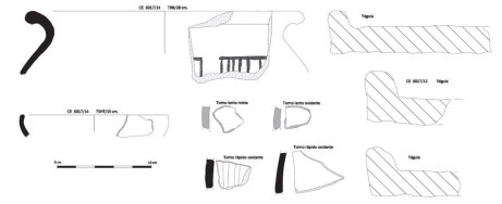 Durante a prospección localizamos varios fragmentos cerámicos que polo seu estado de conservación é difícil a adscrición e varios fragmentos de tegula romana. Esta última, sen dúbida, pertencente á fase de ocupación romana ou pos-romana do sitio. En cambio, no Museo Provincial de Ourense consultamos un total de 31 pezas aló depositadas. Mentres que algunhas delas mostrarían unha ocupación medieval ou pos-medieval –producións vidradas–, dúas pezas poden ser empregadas como datantes dun momento de ocupación tardorromano/tardoantigo: un fragmento de Terra Sigillata Hispánica Tardía (TSHT) correspondente a unha cunca tipo Ritt. 8, moi típica dos séculos IV é V d.n.e. (CE 6017/14); e un fragmento dunha ola de gran tamaño (28 cm. de diámetro) realizada a torno rápido en cocción redutora con labio exvasado e engrosado con decoración mediante liñas brunidas verticais e horizontais. Este tipo de olas remítennos a un momento cronolóxico da segunda metade do século V e, máis probábel, no século VI d.n.e. con paralelos nos próximos xacementos de Castro Ventosa o Astorga (PAZ PERALTA 2013; TEJERIZO GARCÍA e VIGIL-ESCALERA GUIRADO 2017).