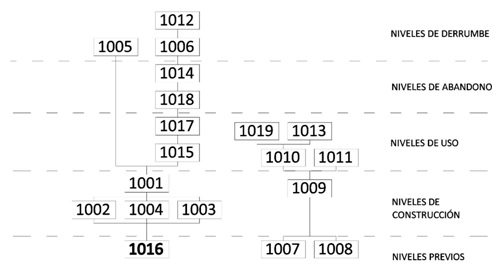 Baixo o enlousado, documéntase a UE 1016,un depósito de terra pouco compactada de cor marrón claro, limosa e moi orgánica, que foi interpretada como unha nivelación do terreo para a instalación do solo. Este UE non foi escavada, sendo o límite da presente intervención e localizada a 2.10m de profundidade co respecto ao punto más alto do muro oeste 1004.
