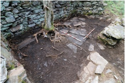 A estratigrafíado interior da estrutura resultou moi simple. En primeiro lugar, documentouse un derrubo interior (UE 3006) composto por cachotes de xisto e cuarcita local, así como grandes fragmentos de lousa, procedentes do lousado orixinal. Se ben se concentraba da parte central ao sur da estrutura, cubría practicamente toda a superficie interior, cunha profundidade máxima entre 20-25 cm. Baixo este derrube documentouse un depósito cincento (UE 3007) de cor marrón escuro ou negra, pouco compactado e limoso, cunha abundante proporción de carbóns que mostrarían a súa orixe a partir dun lume no interior da estrutura. A xa mencionada presenza da árbore no interior estrutura provocou a presenza de gran cantidade de raíces neste estrato. Nesta unidade é onde se localizaron todos os materiais arqueolóxicos asociados á estrutura, que incluíron peites de fusil, balas, diversos metais e fragmentos de lata, unha botella case completa de anís, e de forma moi significativa, un fragmento de mina de carbón (lapis) e restos queimados dun saco recheo de felgos (isto último interpretado coma un posíbel xergón). A potencia foi escasa, cunha profundidade entre os 5-15cm.