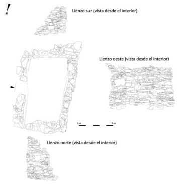Os muros da construción correspóndense ás UEs 3001 (parede norte), 3002 (parede leste), 3003 (parede oeste) e 3004 (parede sur). Da mesma maneira que Morteiras-1, todos eles están construídos a base de cachote e perpiañolixeiramente escuadrado de pedral local, reservando algúns perpiaños mellor escuadrados para o vano da entrada. Debido á forte pendente, para a súa construción escavouse unha profunda cimentación no depósito precedente (UE 3009) de forma perpendicular á pendente, polo que esta é profunda na zona onde se levanta o muro oeste (UE 3003). Esta cimentación é a que permitiu que o muro estivera mellor conservado, cunha altura máxima conservada de 2.5m. Entendemos que esta sería a altura máxima da estrutura. Non obstante, o colapso afectou de forma moi intensa á metade leste da estrutura e, sobre todo á parede UE 3002, que está case perdida. O seu derrubo (UE 3005) esténdese de forma masiva pola pendente abaixo, en dirección ao arroio. A partir da información proporcionada polos derrubamentos interiores (UE 3005), pódese afirmar que a lousado sería a unha auga eestaría composto por un conxunto de vigas de carballo (duns 15-20cm de diámetro) cuberto por lousas de xisto de mediano e gran tamaño, en dirección O-L. Debemos destacar a presenza dunbidueiro na zona suroeste da estrutura que creceu posteriormente ao seu abandono, o que provocou unha importante alteración estratigráfica do contexto.