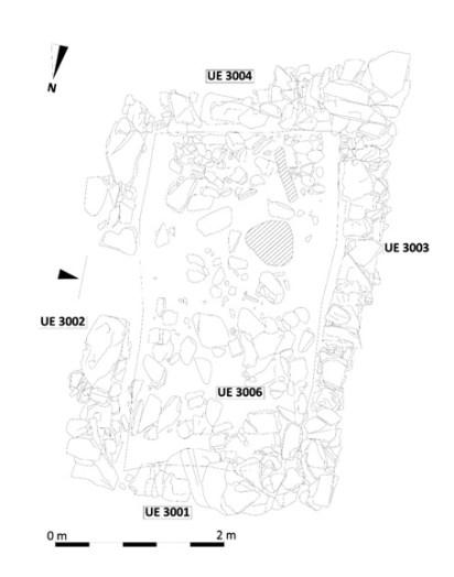 Baixo este enlousado documentouse un depósito de terra de cor marrón escura, de compactación media e limoso-arxiloso moi orgánico (UE 3009), que correspondería a un depósito previo de nivelación sobre o que se construiría unha estrutura. Este nivel non foi escavado, sendo límite da presente intervención.