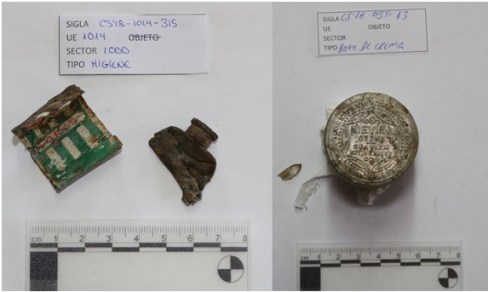 O segundo grupo de obxectos son os botes de cremas de dentes. Os obxectos CS’18-OBJ-20 e CS’18-OBJ-47 corresponden a dous tubos destas cremas. O primeiro é un bote de cor azul con raias brancas que non pode ser recoñecido. Porén, a parte posterior recolle as instrucións de uso, que inclúen palabras como frótese ou enjuáguese, polo que pode ser asociado a unha crema de dentes. O segundo obxecto é un bote de Crema Perborol, como se pode ler na parte dianteira enmarcado por un escudo de cor azul. Na parte traseira pódese ler «PERBOROL / ES EL / ANTISÉPTICO IDEAL PARA LA BOCA / GENERA OXÍGENO / QUE DESTRUYE LAS BAC[TERÍAS] […]LA / CAR[IES] / TONIFICA LAS [E]NCÍAS / BLANQUEA e PULI / MENTA LOS DIENTES / Léase el prospecto». A marca de cremas Perborol comezou a producirse en 1914 pola Compañía Dental Española, creada en 1898 por Florestán Aguilar (González Iglesias, 2009). O produto tivo un gran éxito e difusión en España, como mostra a gran cantidade de anuncios de publicidade da crema dos anos 20 e 30 e incluso anuncios radiofónicos dos anos 40 e 50. De feito, no contexto da posguerra, produtos como Perborol foron parte da propaganda nacionalista do réxime, usando lemas como: Más español que la Giralda es el dentífrico Perborol(Checa Godoy, 2007:148).