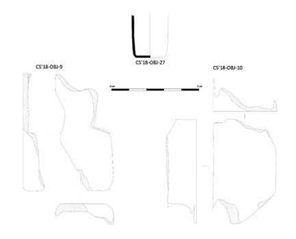O terceiro grupo de obxectos correspondentes a aqueles relacionados coa saúde sonrecipientes de vidro. As pezas CS’18-OBJ-9 e CS’18-OBJ-10 corresponden a dous recipientes de forma cuadrangular e pequeno tamaño (non superiores a 10 cm, aproximadamente), a primeira de vidro de cor marrón e o segundo de vidro cor transparente. Este tipo de formas de vidros están relacionados con medicamentos, normalmente xaropes, antitusivos, vitaminas ou laxantes e son moi comúns nos contextos de conflito e, incluso, documentados no contexto de campos de concentración como o de Castuera (González-Ruibal, 2010:22).