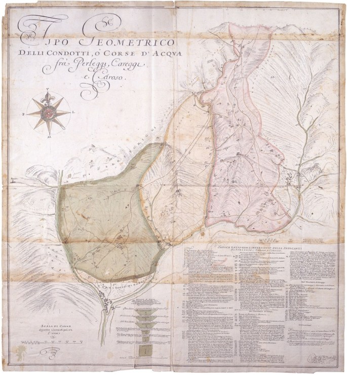 Para resolver estas disputas, a petición de los habitantes de Perlezzi, en octubre del 1752 el Senado de la República de Génova decide enviar al capitano ingegnere Domenico Carbonara, para efectuar una visita local y diseñar un Tipo geometrico para describir, por un lado, la situación de los puntos de captación (prese d’acqua), y por otro, las pretensiones de las partes en pleito (Figura 3). El mapa fue diseñado basándose en las indicaciones de los representantes de las villas de Perlezzi y Caroso, cuyas informaciones fueron transcritas en el detallado Indice de 93 voces. El documento cartografiaba con precisión topográfica la organización del espacio alrededor de los acueductos y, sobre todo, de los puntos de captación, con particular atención a los usos en los comunales, que resultan el verdadero objeto del conflicto. Su posesión es reivindicada por parte de los actores locales a través de la atestación del uso, a través del pasto, la atribución de topónimos particulares -en sí mismos objeto de disputa-, o por la presencia de posesiones individuales como chozos (casoni) o prados y propiedades particulares. A esta cartografía se añadió, en el año 1753, una relación que trataba de reconstruir los derechos de posesión de los bienes de particulares al interior de los comunales. Todos estos elementos fueron utilizados para dividir los espacios comunales entre las aldeas, y en esa división la presencia de bienes de particulares jugó un papel clave. Así, los derechos legados a sujetos particulares se convirtieron en decisivos para la conformación de los espacios colectivos, y, en consecuencia, del propio diseño administrativo del territorio.