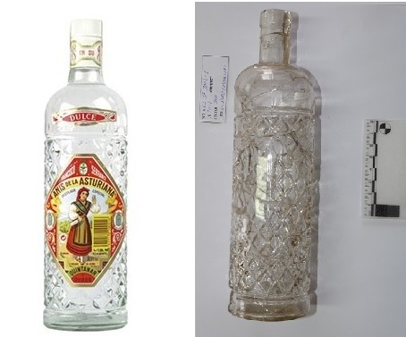 O resto, a pesar das dificultades para determinar as formas específicas, corresponderían a botellas pensadas para a contención de líquidos. A única botella que puido ser reconstruída foi o obxecto CS’18-3007-1, correspondente a unha botella de 50 cl de anís atopada no chozo Morteiras-4. Pola forma e pola distribución da decoración en relevo, se puido determinar que é unha botella de anís marca La Asturiana. Esta marca pertence á empresa Hijos de Francisco Serrano S.A., fundada en 1895 en Oviedo, Asturias, que posteriormente foi trasladada a Quintanar de la Orden, en Toledo. Alí abriron en 1916 a fábrica de Anís de la Asturiana, cuxo anís gañou moita popularidade nas décadas seguintes xunto coa marca Anís del Mono (fundada en 1870 en Badalona). Outro fragmento de vidro de anís (CS’18-OBJ-36) foi recuperado tamén cerca do chozo Morteiras-4, polo que podería corresponder á mesma botella.