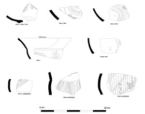 Nesta campaña tivemos a ocasión de revisar o pequeno conxunto de cerámicas depositadas no Museo de Lugo. No conxunto destacan as producións de sigillata tardía, todas coa forma de cunca 37t, co decoración mediante círculos concéntricos, ángulos e medias lúas propias do chamado «segundo estilo» de Mayet ou pertencentes ao grupo 2A/B de Vigil Escalera (Vigil-Escalera, 2015: 290-291 y 294-297). Estas formas dátanse a partir do último cuarto do século IV e ata a metade do século V d.C. A forma PEN-7, polo seu engobe, podería pertencer a unha forma de Cerámica de Imitación de Sigillata descritas por L.C. Juan Tovar (Juan Tovar, 2012), se ben esta adscrición é dubidosa. Máis probábel é que esta peza se corresponda coas formas engobadas PEN-8 e PEN-9, xa que as tres son formas cerradas e ten decoración mediante liñas brunidas verticais e cruzadas. Estas cerámicas poderían corresponder a producións baixoimperiais da cidade de Lugo, similares as formas EJ1 e EJ2 de E.J. Alcorta e R. Bartolomé Abraira, como mostran os seus traballos sobre a cerámica do encrave lucense (Alcorta Irastorza, 2001; Alcorta Irastorza y Bartolomé Abraira, 2012). Polo tanto, o (pequeno) conxunto de cerámicas de Penadominga mostraría unha ocupación do finais do século cuarto e a primeira metade do século V d.C., coherentes co análise das moedas e dos broches xa coñecidos do sitio.